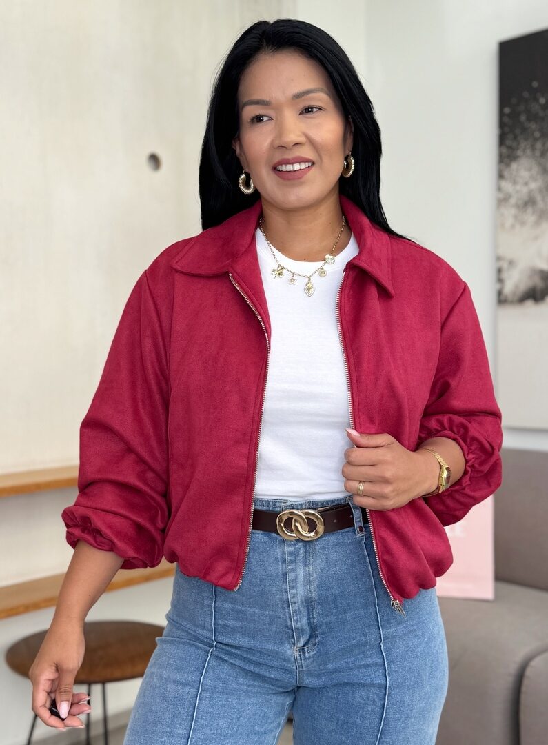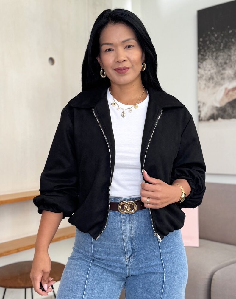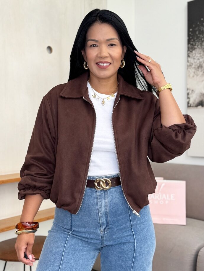 Chaqueta gamuzada, talla normal, elastizada la cintura y manga, forrada con cierre y bolsillos.