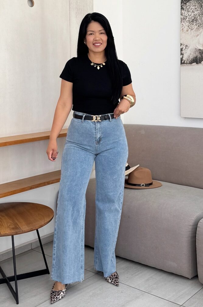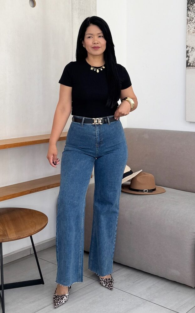 Jean elastizado, tiro alto, la modelo usa talla 38 y mide 82cm de cintura y 106cm de cadera como referencia.