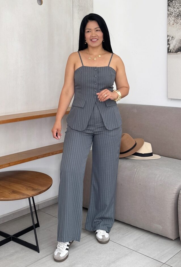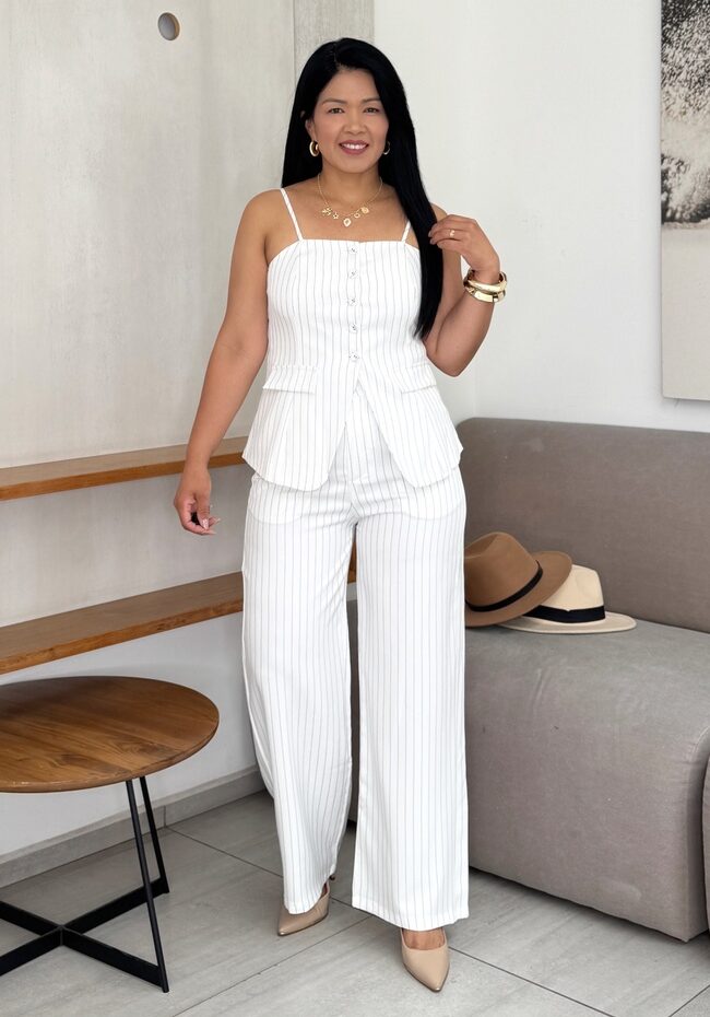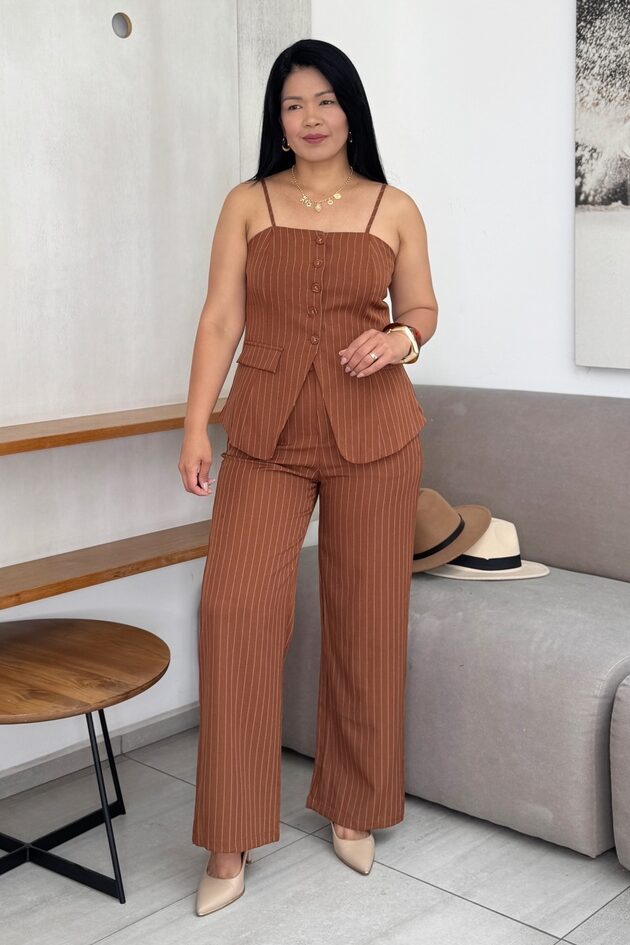 Set sastrero, chaleco elastizado, pantalón elastizado solo en la cintura.