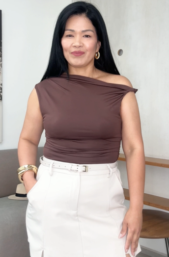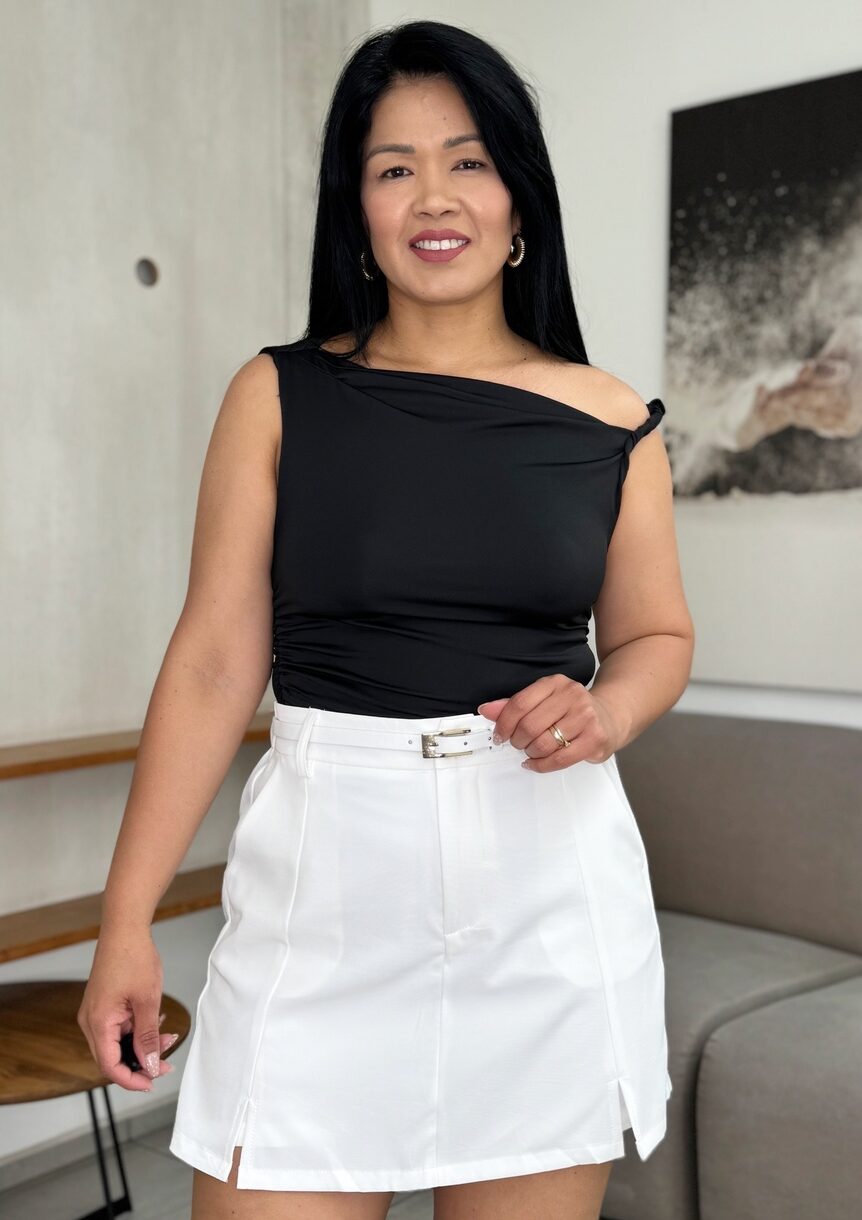 Top elastizado asimetrico, doble tela en el busto, talla normal.